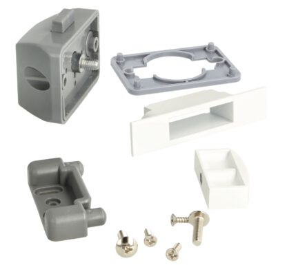 - El pulsador 14.03.045-0 se inserta en la parte delantera y la carcasa se atornilla desde la parte trasera con el tornillo suministrado